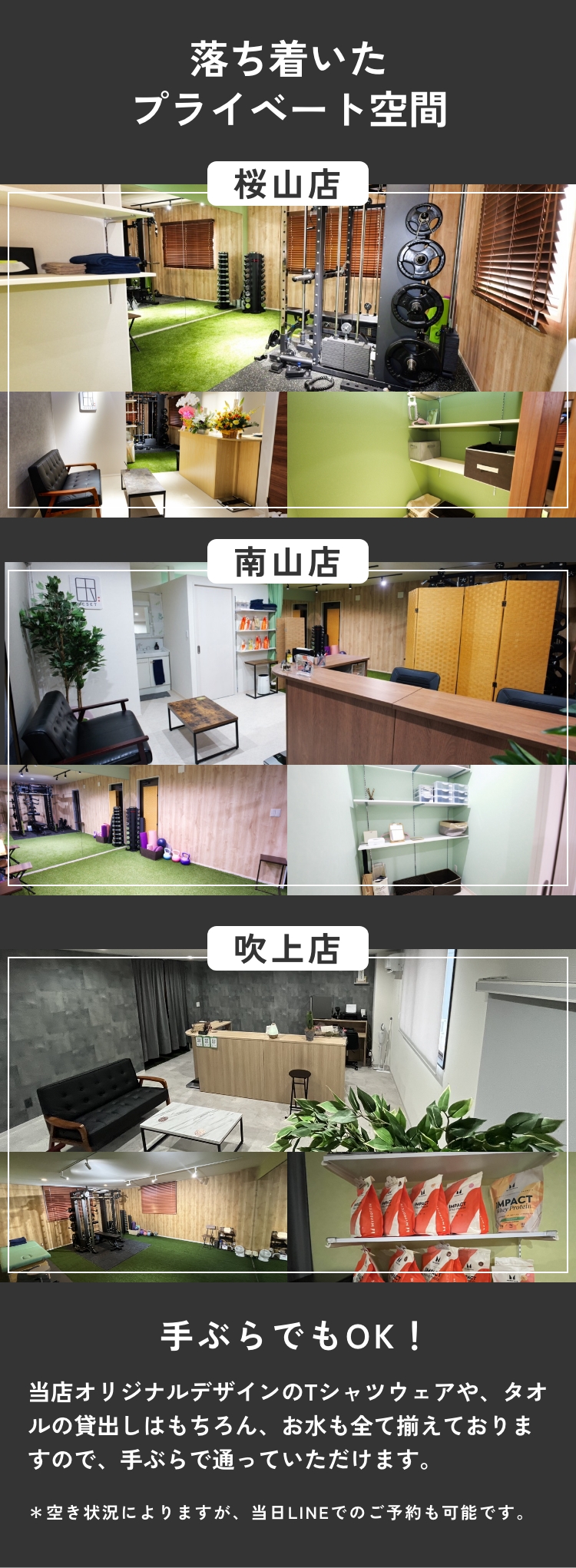 当店公式LINEでは、ご予約はもちろん、お得情報や、ボディメイクについての情報を発信しています。LINEで気軽に悩み事などお聞かせください!トレーナーがサポートします!